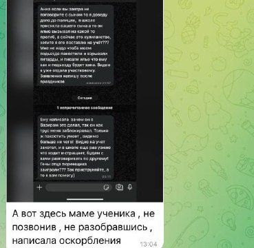 Затем педагог стала активно писать родителям этих детей (причем уже в час ночи). Не дождавшись ответа написала жалобу инспектору по делам несовершеннолетних. А сейчас собирается писать заявление в полицию, по факту якобы хулиганства.