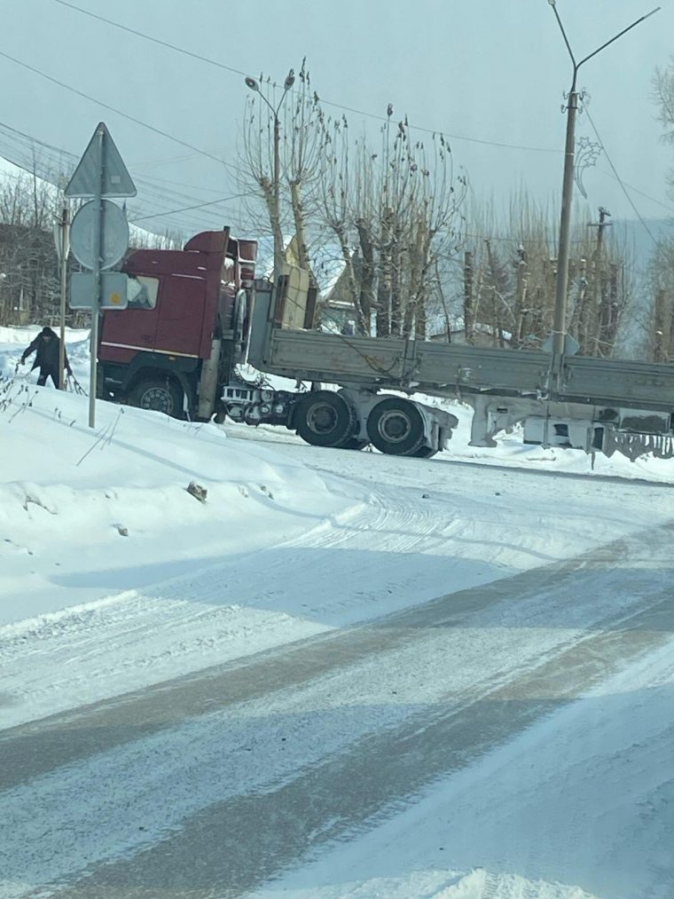 Вчера днем полуприцеп на долгое время перегородил центральную дорогу в Старом Усть-Куте