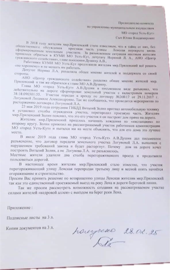 Власти города на месте единственного съезда к реке из микрорайона Закута, на месте бывшего Приленского ЛПХ, сформировали земельный участок и он без торгов был передан в аренду на 20 лет бывшему сотруднику ГАИ